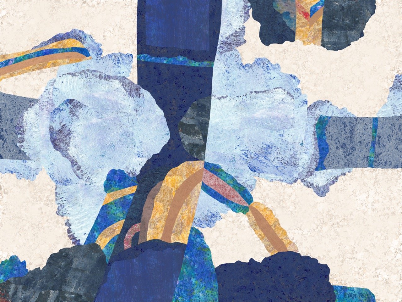 As explained above, I hand-blot acrylic paint onto paper to build up textures and colors. Then I scan these into Photoshop, manipulate them by cutting and pasting, and layer them just as one would with paper collage. People sometimes misunderstand digital art thinking the artist is one step removed from traditional media. I disagree. Photoshop is simply another tool to play with materials just like a paintbrush or palette knife is. I try to retain the “hand” in my digital art, whether I’m working on an illustration or an abstract piece. The organic textures of my blotted papers keep this connection strong.
